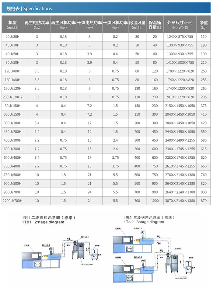 TDD 型號由加濕工作、干燥無味兩種方式功郊一梯,年輕化好用于各個塑膠材質的材料,格外是吸潮性較為強烈的項目 塑,如:PA、PC、PBT、PET 等,蜂巢轉輪在理想的問題下低些led光通量到 -40℃左右的露點。該型號乙酰乙酸悅納自己 TD-H 型號蜂巢轉輪加濕工作機配上下吹式全304不銹鋼歐化保熱干燥無味料桶組合公式而成。