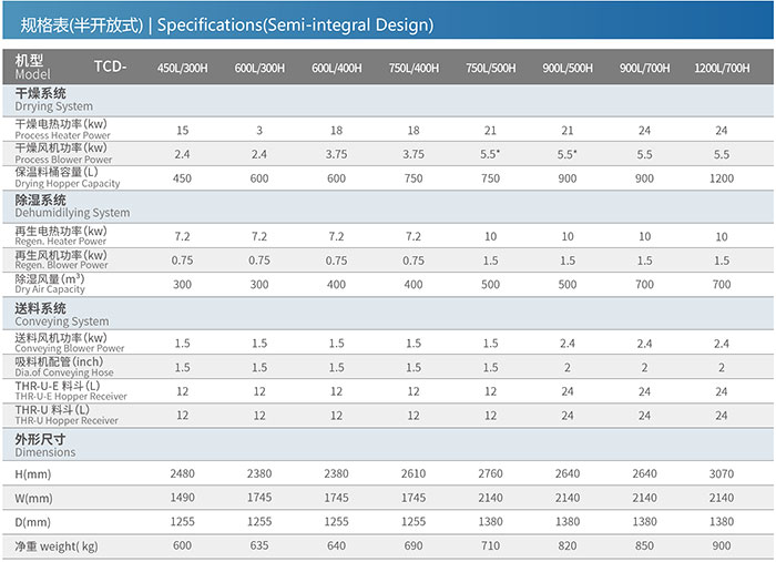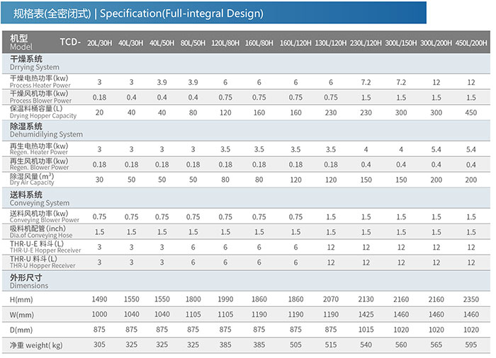 TCD series dehumidification drying combined feeding and dehumidification, drying, 2 feed three functions in one, is widely used in all kinds of plastic raw materials, especially the hygroscopicity strong engineering plastics, such as PA, PC, PBT, PET, TCD - H in the ideal state is the lowest of dew point to 40 ℃, This series of products is made of TD-H series honeycomb transmission dehumidifier com?bined with down-blown all stainless steel European thermal insulation drying drum. The whole series adopts the P.l.D temperature control system as the standard accessories, and also provides PLC control with LCD touch man-machine interface for optional selec?tion, dew point meter and automatic filler for optional selection.